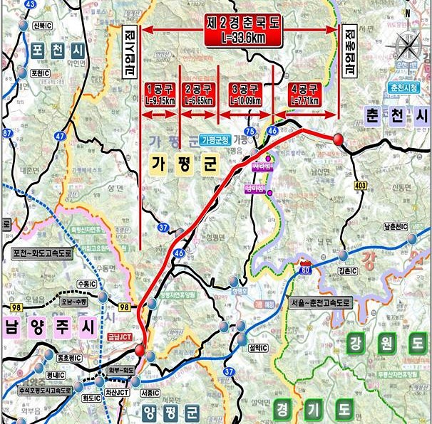 한편 공사기간 단축을 위해 공사 구간을 경기도와 강원도가 각 2개 구간씩 총 4개 구간으로 나눠 추진한다. 경기 제1·2공구는 서울국토관리청이, 강원 제3·4공구는 원주국토관리청이 담당한다.