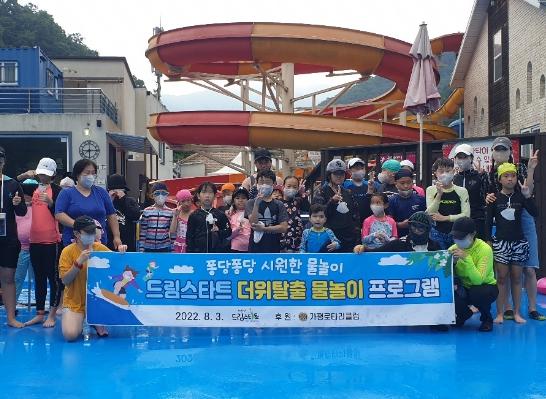 [한국뉴스타임=편집국] 가평군 드림스타트는 어제 2022년 8월 3일 드림스타트 사례관리아동 및 보호자 56명 대상으로 가평군 북면 소재의 별비치 워터파크에서 물놀이 체험 프로그램을 진행했다고 밝혔다.