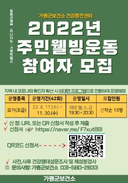 주민웰빙운동은 주 3회 월, 수, 금 저녁반으로 선착순 15명을 편성하여 가평군보건소 건강증진센터에서 전문강사와 직접 대면하여 프로그램이 진행되며, 사전·사후 건강행태 설문조사 및 체성분검사, 요가수업이 총 42회로 이루어진다. 신청기간은 8월 1일 부터 8월 10일까지이며 ‘가평군보건소 건강증진센터’ 카카오 채널을 통해 참여 신청서를 작성하여 제출하면 신청이 가능하다. 다만, 대면 프로그램 진행 중 지역 내 코로나 19 확진자 급증시 비대면 프로그램(ZOOM)으로 전환하여 운영될 예정이다.