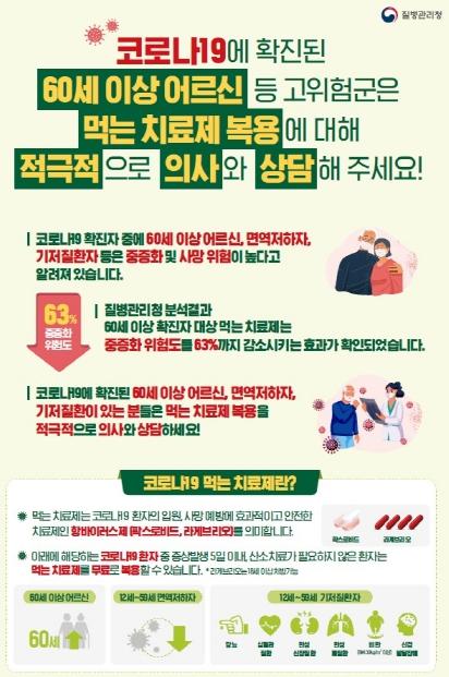 질병청 연구결과에 따르면, 팍스로비드를 투약할 경우 60세 이상 확진자의 중증화 위험도는 63%, 사망위험도는 56% 감소하는 것으로 나타났다.