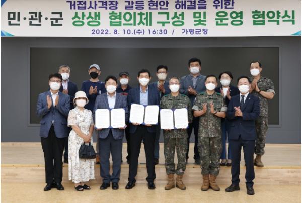 가평군은 10일 군청 대회의실에서 서태원 가평군수, 7군단장 고현석 중장, 엄기용 대책위원장 등 민ㆍ관ㆍ군 협의체 관계자 15명과 가평군의회 최정용 의장, 양재성ㆍ이진옥 의원 등 관계자가 참석한 가운데 ‘거접훈련장 갈등 현안 해결을 위한 민ㆍ관ㆍ군 상생 협의체 구성 및 운영 협약’을 체결했다.