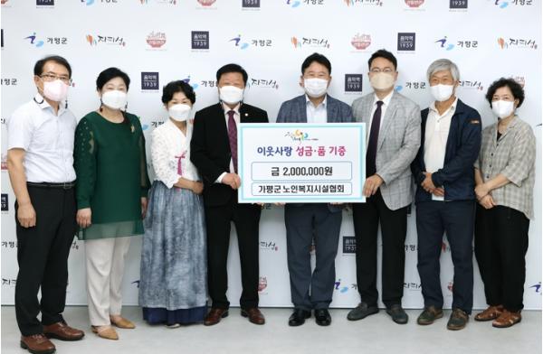 [한국뉴스타임=편집국] 지난 11일 가평군 노인복지시설협회에서 물가상승과 지속되는 장맛비로 힘든 시기를 보내고 있는 지역 내 소외이웃들을 위해 협회 회원들이 십시일반 정성을 모아 이웃돕기 성금을 군에 기탁하여 전달식을 가졌다.