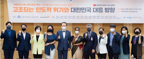 17일 오전 김영주 국회부의장, 국회 외교통일위원회 간사 이재정 의원, 월드비전이 공동으로 주관하고 30명의 의원이 공동으로 주최하는 '고조되는 인도적 위기와 대한민국 대응 방향 토론회'가 개최되었다. 이번 토론회에서는 아프가니스탄 사태 1주기를 맞아 방한한 아순타 찰스 Asunta Charles 아프가니스탄 월드비전 회장이 기조 발제를 맡았고, 남상은 월드비전 실장과 장은하 한국여성정책연구원 박사가 주제 발표를 진행하였다. 주제발표 이후에는 박명희 국회입법조사처 입법조사관, 데이비드 말질리쉬 David Maizlish ICRC 한국사무소 대표, 현미주 외교부 과장, 이경주 KCOC 부장의 토론과 질의응답 순으로 진행되었다.