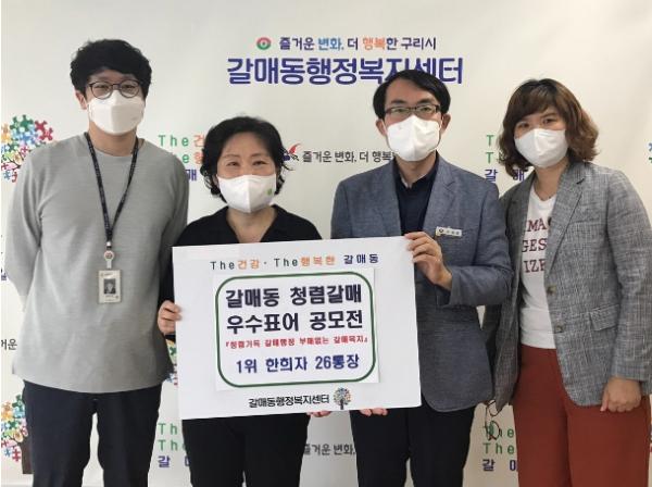 [한국뉴스타임=편집국] 구리시 갈매동 행정복지센터(동장 조영훈)는 17일 주민과 함께하는 '갈매동 청렴갈매 우수표어 공모전'을 통해 선정한 우수 표어를 발표했다.