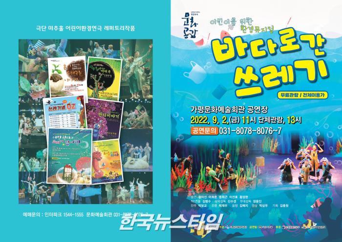 [한국뉴스타임=보도국] 가평군시설관리공단은 한국문화예술회관연합회가 주최하는 2022년 ‘문예회관과 함께하는 방방곡곡 문화공감’ 사업의 첫 공연인 어린이 환경뮤지컬 ‘바다로 간 쓰레기’를 오는 9월 02일 금요일 가평문화예술회관 공연장 무대에 올린다.