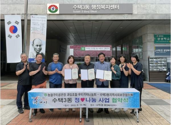 [한국뉴스타임=편집국] 구리시 수택3동 지역사회보장협의체(민간위원장 이영행, 공공위원장 이영희)와 ‘농협구리공판장 과일조합 우리끼리나눔회(조합장 배진수)’는 18일 수택3동 행정복지센터에서 "정♡나눔" 사업 추진을 위한 업무 협약식을 체결했다.
