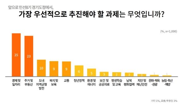 경기도가 여론조사기관 케이스탯리서치에 의뢰해 지난 7월 9일 도민 1천 명을 대상으로 ‘민선 8기 경기도정 출범 관련 인식’을 조사한 결과, 최우선 추진 과제는 ‘경제 및 일자리’(25%), ‘주거 및 부동산’(23%)이 가장 높았다. 이어 ‘도내 지역균형 발전’(10%), ‘복지 및 보육’(9%), ‘교통’(9%), ‘청년정책’(6%), ‘환경·에너지’(5%) 등의 순이었다.