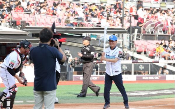 염 의장은 이날 열린 수원 KT위즈와 광주 KIA타이거즈의 경기에 앞서 그라운드에서 관중들에게 KT위즈의 승리를 향한 메시지를 전한 뒤 김 지사의 시구를 시타했다.