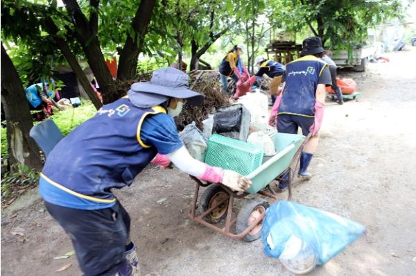 지난 18일에는 ‘노사 한마음 봉사단’이 안산시 상록구 팔곡일동 일대에서 수해 지역 긴급 복구 봉사활동에 함께했다. 침수 농가에 유입된 토사 제거, 가재도구 세척과 폐자재 정리 등에 힘을 보탰다.