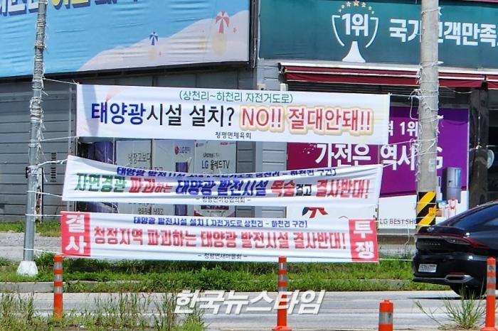 청평면 일대에는 지역 단체명의로 ‘청정지역 파괴하는 태양광 발전시설 결사반대’, ‘자연경관 파괴하는 태양광 발전시설 목숨 걸고 결사반대’, ‘태양광시설 설치? NO!! 절대 안돼!!’ 문구의 현수막을 곳곳에 게재하며 반대하고 있다.