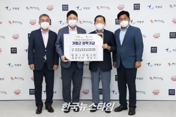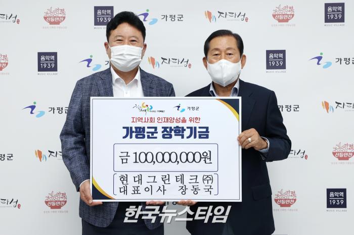 [한국뉴스타임=편집국] 지난 8월 18일, 장동국 현대그린테크(주) 대표이사가 가평군에 장학금을 기부했다. 장동국 대표는 18일 오후 가평군청을 방문, 가평군 교육발전을 위한 장학금 1억원을 전달했다.