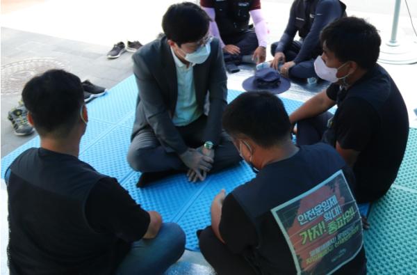 장철민 의원은 먼저 화물연대 측과 약 1시간 가량 면담을 진행했다. 이 자리에는 화물연대 박수동 하이트진로지부 2지회장, 이진수 하이트진로지부 부지부장, 김경선 대전지역본부 본부장이 함께했다.