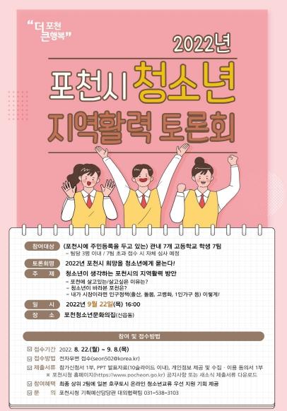 [한국뉴스타임=편집국] 포천시는 8월 22일부터 9월 8일까지 ‘2022년 포천시 청소년 지역활력 토론회’에 참여할 참가자를 모집한다.