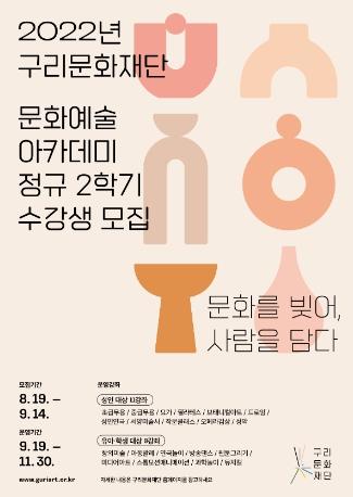 구리문화재단(이사장 백경현)이 9월 14일까지 '2022년 문화예술 아카데미 정규 2학기' 수강생을 모집한다.
