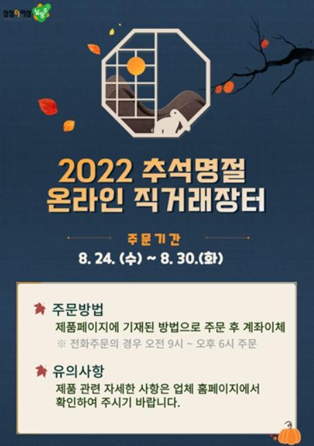 [한국뉴스타임=편집국] 남양주시는 추석 명절을 맞아 온라인 직거래장터를 24일부터 오는 30일까지 7일간 운영한다고 밝혔다.