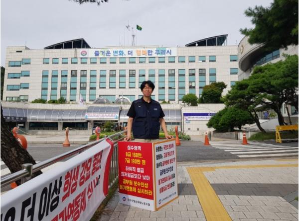 [한국뉴스타임=편집국] 박운평 구리시청 공무원노동조합 위원장이 공무원 임금의 물가연동제를 요구하며 1인 시위에 나섰다.