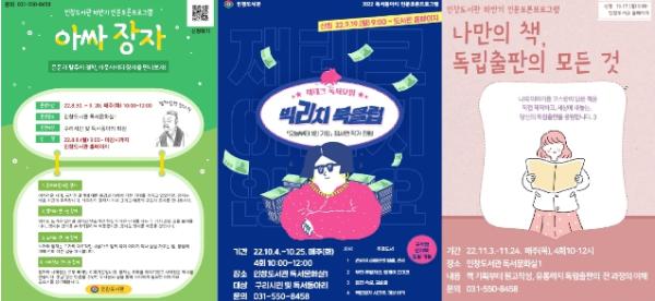 인창도서관에서는 8월 30일부터 11월 24일까지 매월 4회, 동양철학, 경제·자기계발, 독립출판을 주제로 구리시민의 인문학적 소양 증진 및 건전한 토론문화 확산을 위해 작가와 함께하는 인문·토론프로그램을 운영할 예정이다.