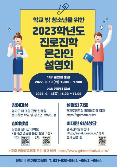 [한국뉴스타임=편집국] 경기도교육청이 2023학년도 대입을 준비하는 학교 밖 청소년을 지원하기 위해 진로 진학 설명회를 실시간 온라인으로 개최한다.