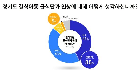 경기도가 지난 8월 17일부터 18일까지 도민 1천 명을 대상으로 실시한 여론조사에서 도민의 86%가 이번 결식아동 급식단가 인상 결정에 대해 ‘잘했다’라고 평가했다고 25일 밝혔다.