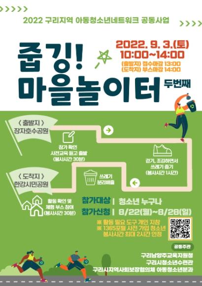 “줍깅! 마을놀이터 2”는 2022년 9월 3일 오전 10시부터 오후 3시까지 관내 초, 중, 고 연령의 청소년 500여 명을 대상으로 실시된다.