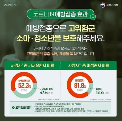 최근 우리나라 18세 이하 소아·청소년 코로나19 감염 사망자 44명 중 기저질환이 있는 대상이 23명(52.3%)이었고, 사망자 중 미접종자의 비율은 18명(81.8%)로 나타났다. 해외의 임상시험 연구 결과, 소아용 백신을 접종한 5~11세의 입원예방효과는 74%로 확인되어 효과성이 입증된 바 있다.