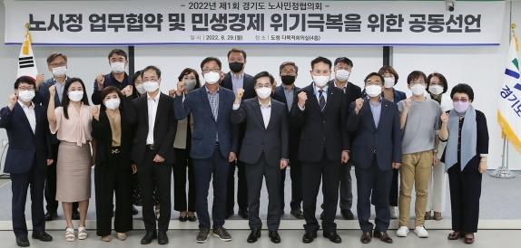 김동연 경기도지사는 29일 경기도청 다목적회의실에서 열린 민선 8기 첫 노사민정협의회 본회의에서 주요 참석자들과 이 같은 내용의 ‘민생경제 위기 극복을 위한 노사민정 공동선언문’을 발표했다.