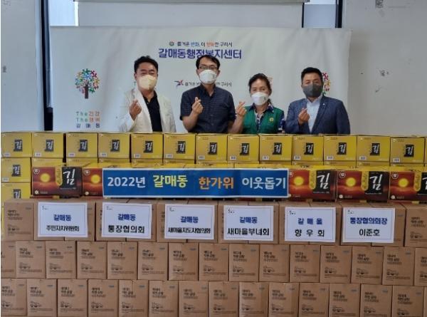 [한국뉴스타임=편집국] 구리시 갈매동 행정복지센터는 1일 추석맞이 이웃돕기 물품 합동 전달식을 가졌다.