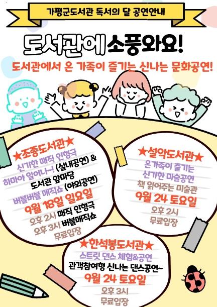 [한국뉴스타임=편집국] 가평군 도서관 4개소에서 9월 독서의 달을 맞이하여 다채롭고 풍요로운 독서문화진흥행사를 운영한다. 이번 행사는 지역문화를 더욱 더 다채롭게 하고 주민들의 참여를 위하여 가을, 힐링을 키워드로 전시, 체험, 강연, 공연 등의 참여 프로그램을 진행할 예정이다.