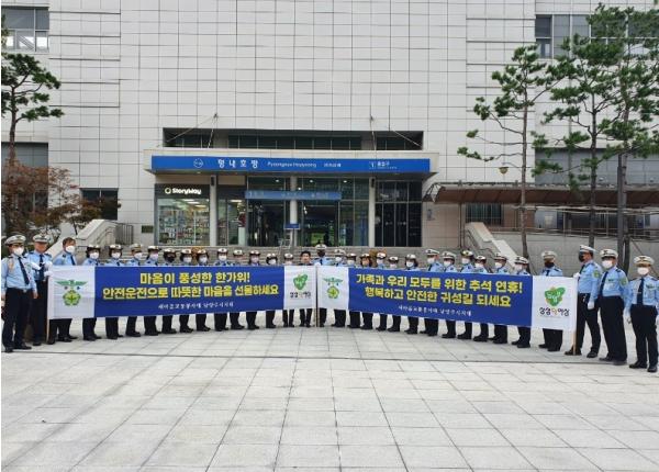 이날 새마을교통봉사대 남양주시지대는 ‘마음이 풍성한 한가위! 안전운전으로 따뜻한 마음을 선물하세요!’, ‘가족과 우리 모두를 위한 추석 연휴! 행복하고 안전한 귀성길 되세요.’등의 구호를 외치며 명절을 맞아 이동하는 시민들의 안전을 기원했다.