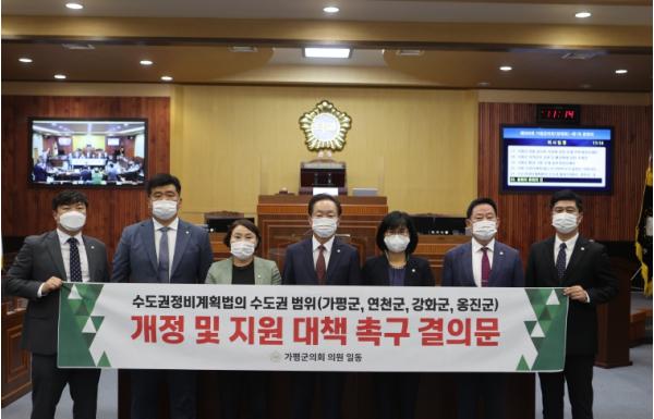 한편, 본회의 안건 제안설명에 앞서 강민숙 의원은 소상공인 지원대책과 재난지원금 지급 관련 향후 계획에 대한 5분 발언을 했고, 가평군의회에서는'수도권정비계획법'의 수도권 지정으로 인해 지역발전을 가로막고 인구 위기를 심화시키고 있는 현실을 개선할 것을 강력하게 요청하기 위해'수도권정비계획법의 수도권 범위 개정 및 지원 대책 촉구 결의문'(이진옥 의원 대표발의)을 채택했다.