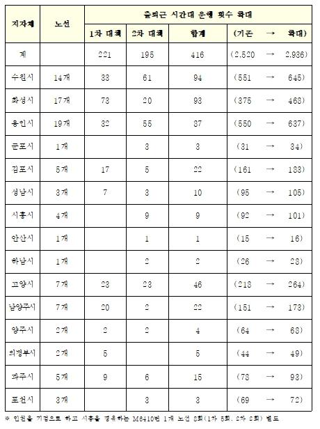 이를 위해 수원 7770번 등 54개 노선에 전세버스를 투입해 운행 횟수를 89회 늘리기로 했다. 또한 고양 M7731번 등 33개 노선에는 정규버스 53대를 증차해 운행 횟수를 106회 추가할 방침이다.