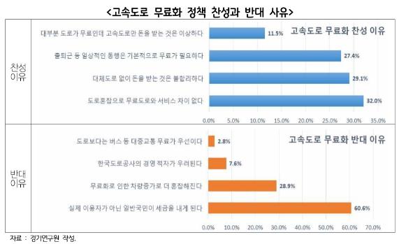 고속도로 무료화를 찬성한 350명은 그 이유로 ▲무료도로와 서비스 차별화 실패(32%) ▲대체도로 없는 유료는 불합리(29.1%)를 주로 꼽았으며, 무료화 반대 250명은 그 이유로 ▲실제 이용자가 아닌 일반시민들이 세금으로 고속도로 비용을 충당(60.6%) ▲무료화로 인한 차량 증가와 혼잡문제 우려(28.9%)를 제시했다.