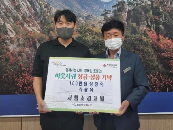 [한국뉴스타임=편집국] 가평군 소재의 서림조경개발은 2일 추석 명절을 맞아 조종면행정복지센터를 방문하여 관내 취약계층을 위해 100만원 상당의 식용유를 기탁했다.