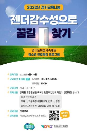[한국뉴스타임=편집국] 경기도여성가족재단이 경기도 내 중·고생을 대상으로 전문직업인 진로 특강 프로그램 ‘젠더 감수성으로 꿈길 찾기’를 9월 14일부터 11월 말까지 진행한다.