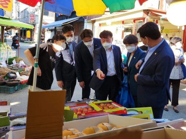 재래시장 방문에는 남종섭 대표의원을 비롯해 김판수 부의장, 황대호 수석대변인, 고은정 기획수석 등이 함께해 온누리 상품권으로 추석 성수물품을 직접 구매하면서 상인들의 애로사항을 청취했다. 화서시장에서는 이영수 상인회장 및 김태균 총무 등이 동행했다.