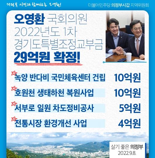 [한국뉴스타임=편집국] 오영환 국회의원(더불어민주당, 의정부시 갑)은 의정부시 갑 지역의 2022년도 1차 경기도 특별조정교부금 29억 원이 확정됐다고 8일 밝혔다.