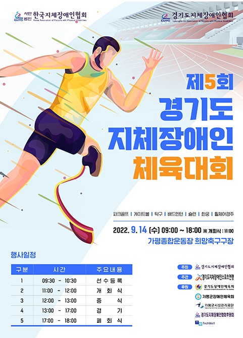 [한국뉴스타임=보도국] 오는 14일 지체장애인의 건강증진 도모와 생활체육의 저변확대를 위한 제5회 경기도지체장애인체육대회를 가평군 희망구장에서 개최한다.