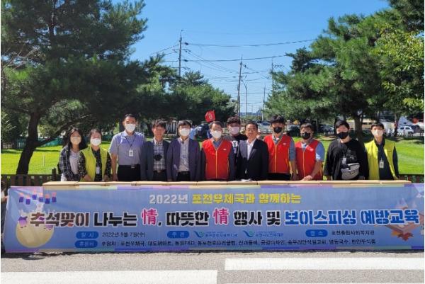 매년 나눔 활동을 이어오고 있는 포천우체국 행복나눔봉사단은 지역 내 취약가구 200명에게 100만 원 상당의 식품을 후원했으며, 보이스피싱 예방교육도 함께 진행했다.