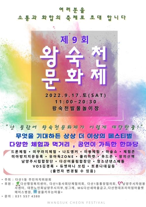 올해로 9회째를 맞은 ‘왕숙천 문화제’는 다산1동 주민자치위원회가 주최하고, 다산행정복지센터, 다산1동 사회단체협의회, 다산1동 통장협의회, 현대프리미엄아울렛스페이스원, 빙그레 등의 후원으로 진행된다.