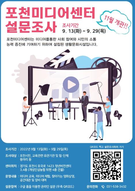 [한국뉴스타임=편집국] 올해 11월 개관을 앞둔 포천시 영상미디어센터는 오는 29일까지 포천시민을 대상으로 한 미디어 교육프로그램 운영을 위한 온·오프라인 설문조사를 실시한다.