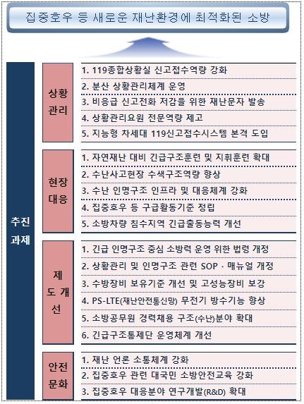 ‘집중호우 관련 대국민 소방안전교육 강화’과제는 소방안전체험관의 체험교육과 다중이용시설 등 대상 소방훈련이나 안전교육시 자연재난 대응 요령을 교육하는 내용을 포함한다.
