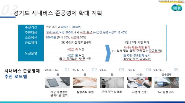 올 연말까지 시군 재정 협의 등을 마쳐 시행 기반을 마련한 후, 실행계획 수립, 사업자 선정 등의 절차를 밟아 오는 2023년 하반기부터 2026년까지 200개 민영제 시내버스 노선을 준공영제로 전환할 방침이다.