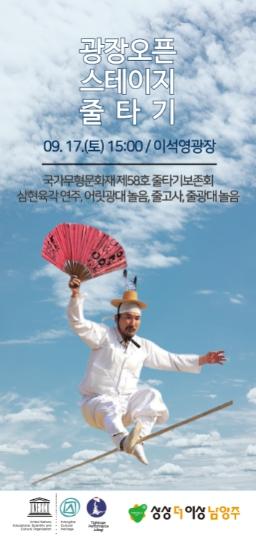 시 관계자는 “줄타기는 주로 단오나 추석 등 명절날에 연희된 놀음으로 추석 명절은 지났지만 줄 위로 날아오르는 광대들의 멋진 놀음과 더불어 줄 타는 사람과 구경꾼이 어우러진 놀음판을 가족과 함께 즐기며, 국가무형문화재인 줄타기의 의의를 되새겨 볼 수 있는 시간이 되길 바란다.”라고 전했다.