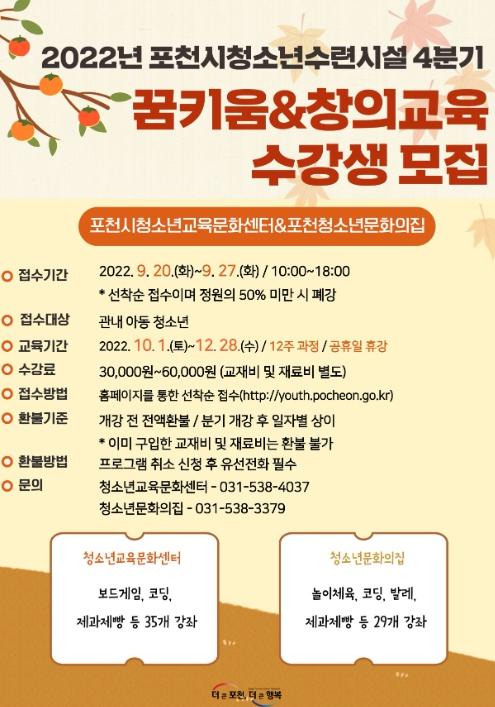 [한국뉴스타임=편집국] 포천시 청소년수련시설(포천시청소년교육문화센터 및 포천청소년문화의집)은 포천시 청소년들을 대상으로 건전한 여가생활을 위한 꿈키움(정규)·창의교육 프로그램 수강생을 모집한다.