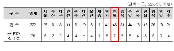 공사중단 방치건축물 지역별 현황을 보면 강원도가 전국 광역자치단체에서 가장 많은 46곳(14.2%)이 확인됐고, 충남 44곳(13.7%), 경기 41곳(12.7%) 순이다.
