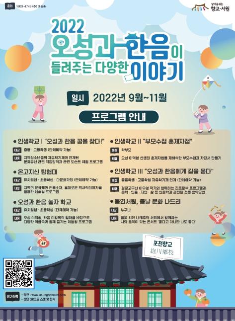 시 관계자는 “과거 교육기관이었던 용연·화산서원, 포천향교의 본래 기능을 활용해 지역문화재 보존과 애향심 고취에 기여하고, 시의 대표 캐릭터인 오성과 한음의 이야기를 담은 프로그램인 만큼 많은 시민들의 관심과 참여 바란다.”고 전했다.