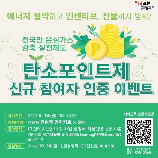 [한국뉴스타임=편집국] 포천시는 탄소포인제 활성화 및 시민 참여율 제고를 위해 탄소포인트제 신규 참여 인증 이벤트를 운영한다.