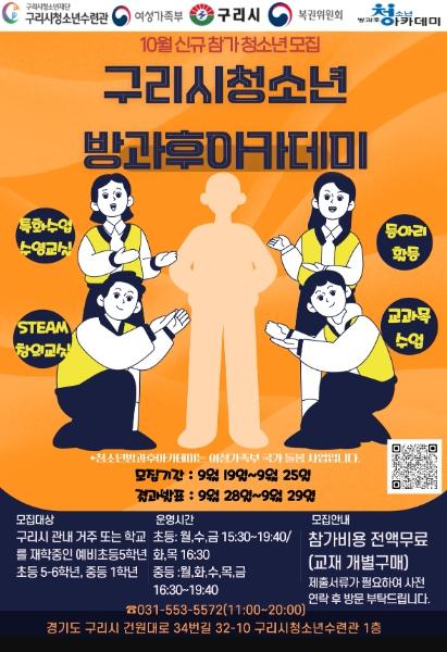 [한국뉴스타임=편집국] 구리시청소년재단 구리시청소년수련관(관장 추은아)이 9월 19일부터 25일까지 ‘늘푸름청소년 방과후아카데미’ 10월 신규 참가 청소년을 모집한다.