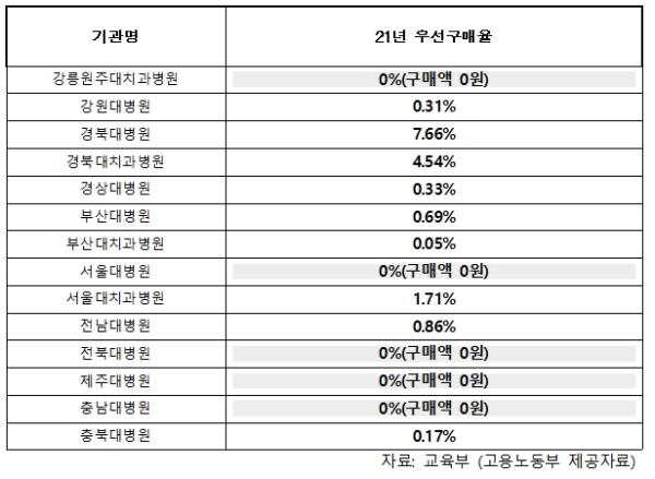 공공기관의 구매액과 구매비율이 매년 지속적으로 상승하고 있는 가운데, 국립대병원 14곳 중 △서울대병원 0% △전북대병원 0% △충남대병원 0% △제주대병원 0% △강릉원주대치과병원 0%(구매액 0원)로 5곳의 대학병원은 단 1원의 생산품도 구매하지 않은 것으로 나타났다.