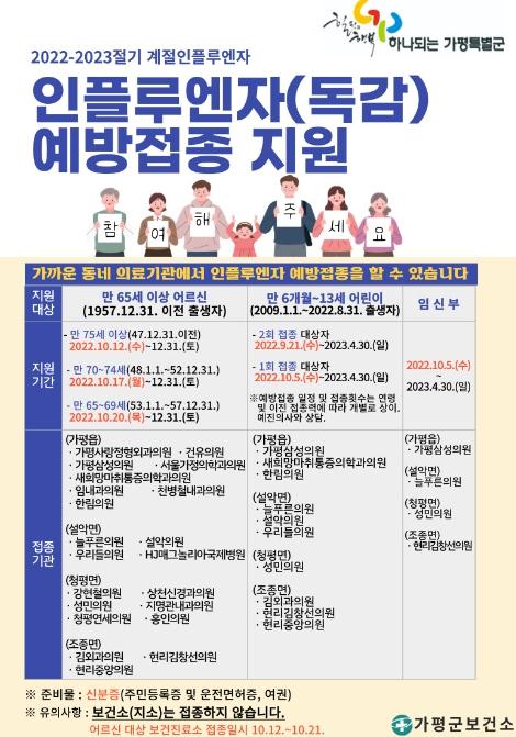 가평군의 경우 접종 장소는 주소지와 관계없이 위탁의료기관에서 접종이 가능하며, 만 65세 이상의 경우 관내 15개의 보건진료소에서도 가능하다. 가평군보건소와 보건지소는 지자체 예방접종사업과 코로나19 예방접종 사업에 집중하여 인플루엔자 예방접종은 어려울 것으로 전망된다.